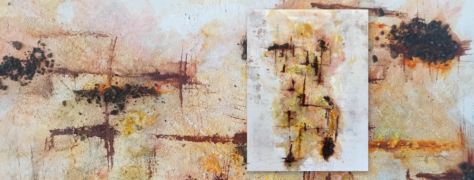 Meine Arbeitsweise entsteht aus dem freien Spiel mit den unterschiedlichsten Materialien: Erde, Folie, Acryl, Firnis, Strukturpaste und andere Materialien aus der Natur treten in einen spannenden Dialog. Jeder Werkstoff bringt seine eigene Ausdruckskraft mit und zwar rau, glänzend, weich oder pastos. Ich habe keinen festen Plan, keine Skizze, kein vorgefasstes Konzept. Stattdessen folge ich ausschließlich meinem Gefühl. Spontan und intuitiv entstehen meine Werke, die ebenso lebendig wie überraschend sind.